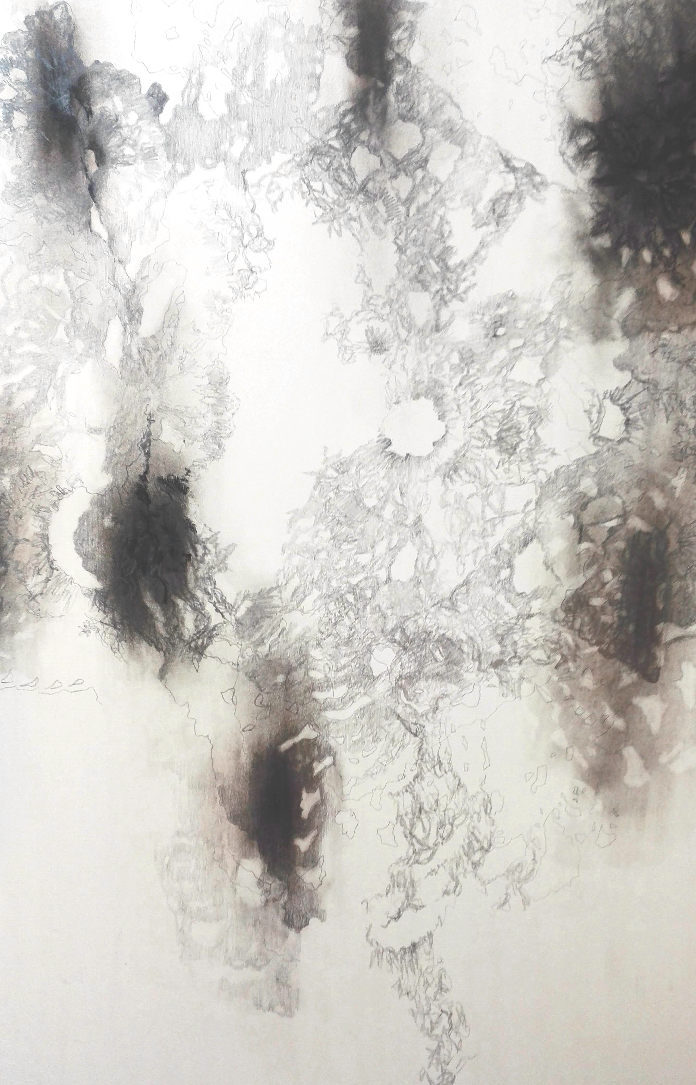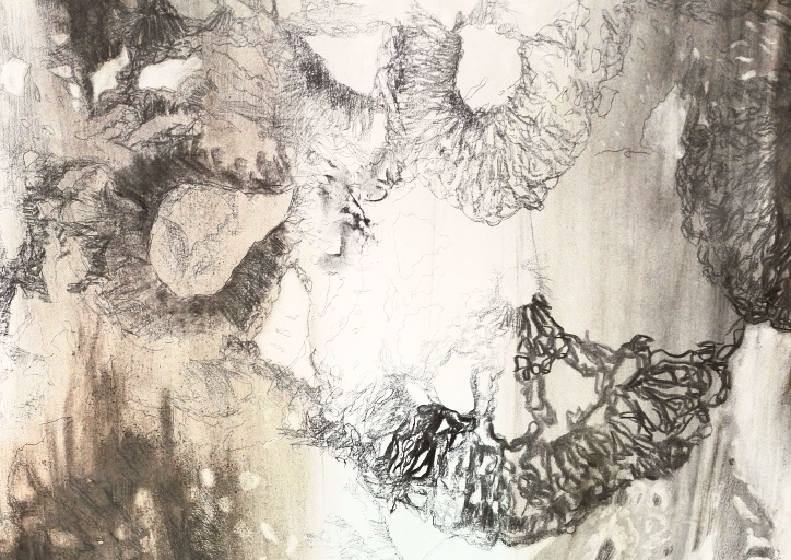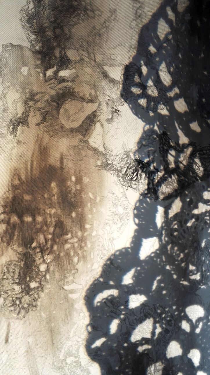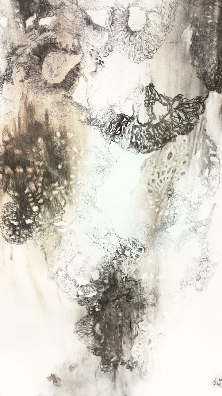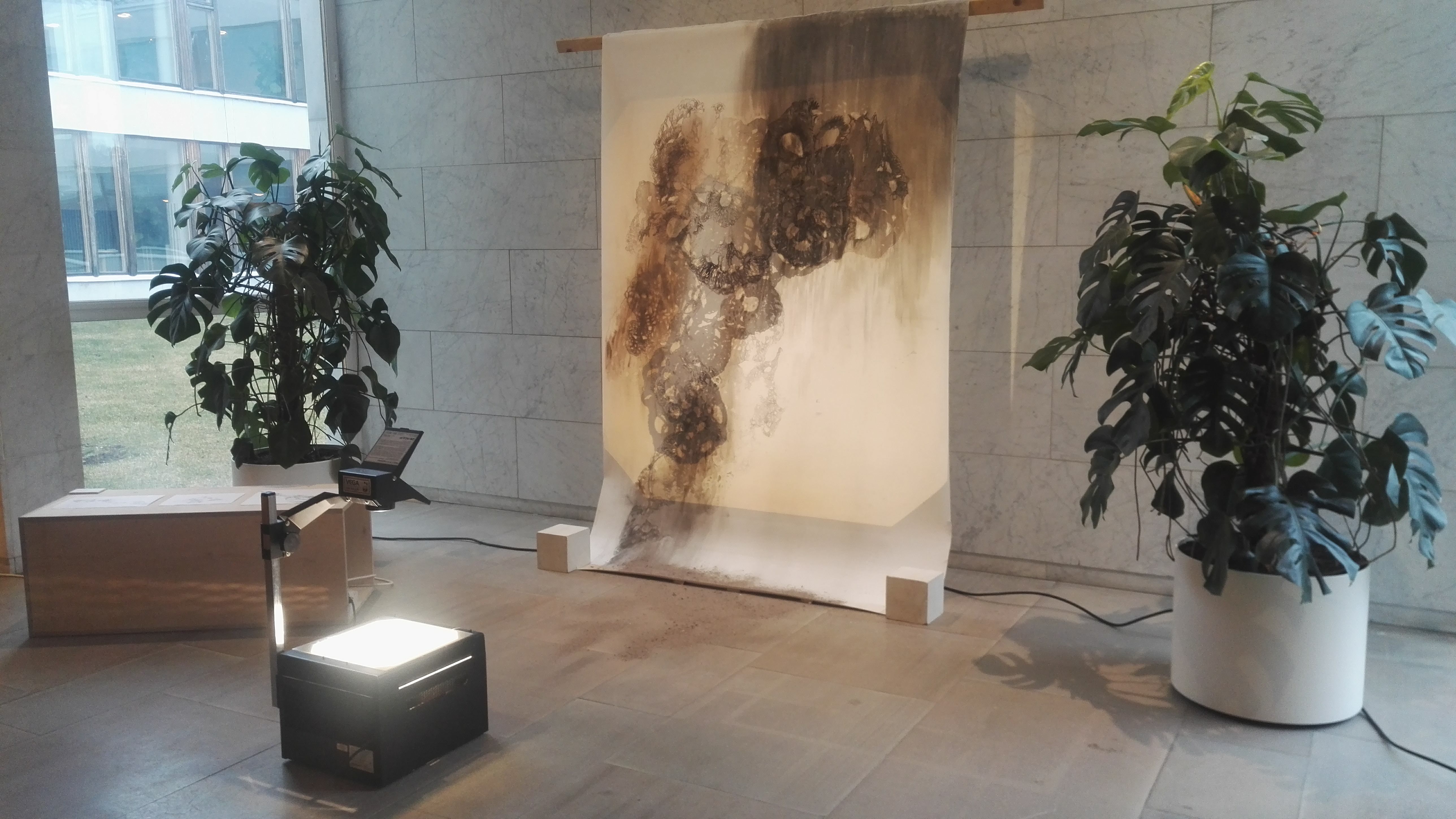 Drawing Installation; paper, pencil, charcoal, ash, overhead projector, crochet works; (large work) 126cm x 257cm