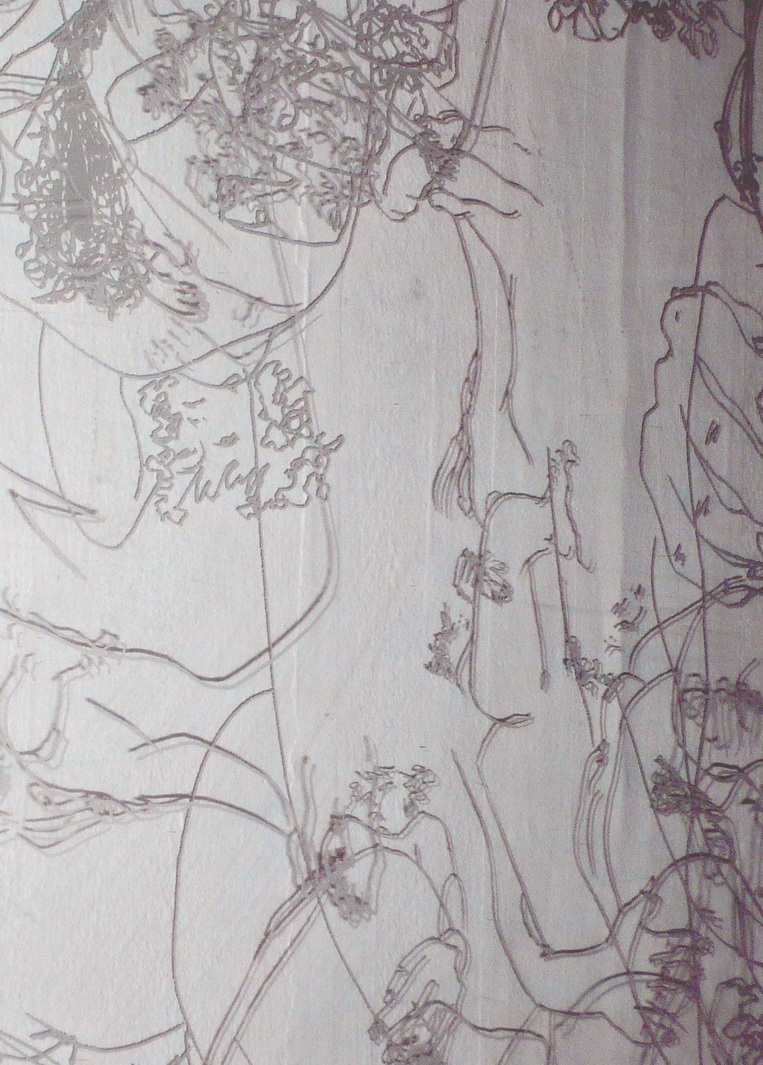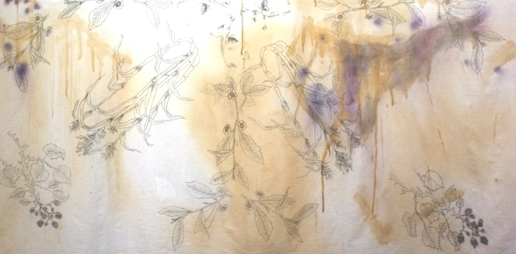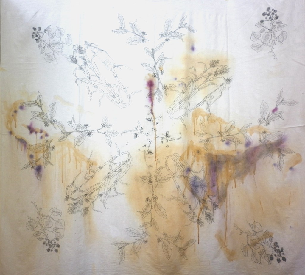 Tablecloth: linen cloth, pencil, tea, sugar, blackberry juice, milk stains; 120cm x 120cm