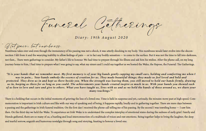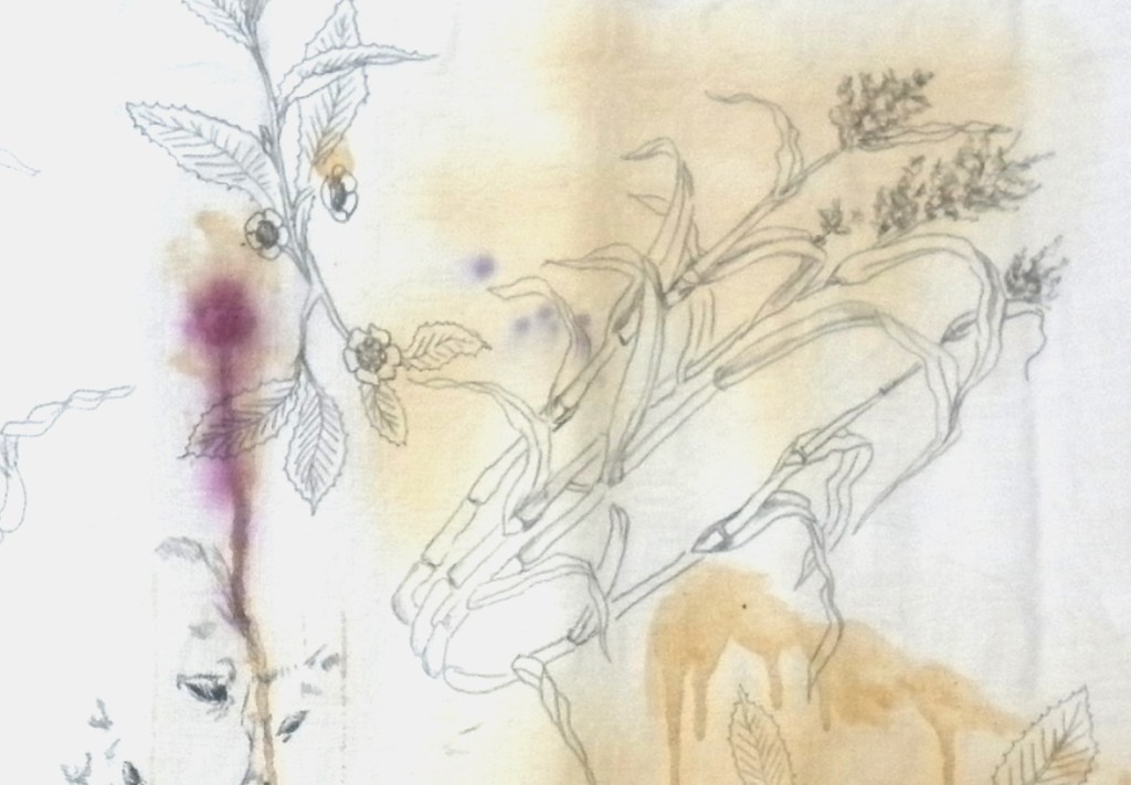 Tea is integral to my mother culture and during times of vulnerability, tea is overflowing. Coming together with tea – as event, as substance, as ingredient – is intrinsic to how my family have gathered together over years. It is part of every gathering – big and small – every visit and happening. In vulnerability, coming together with tea invokes comfort and familiarity. It warms the belly, filling-in feelings of hollowness and anguish. But it is layered with complexity and complications. Ladened with complicated ingredients. Afternoon Tea feels heavy and stained with spillages of colonialism, privilege, unconscious consumption, status, family, bias and grieving processes that permeate and percolate. To work with the ingredients of “Afternoon Tea” is to digest the stains of it, the connections and mapping of it. The work “Afternoon Tea” is a drawn and painted tablecloth, digitalized and deepened with a collection of quotations, thoughts and memories that connect back to drawings and stains of tea ingredients. The tablecloth showing multiple maps of the grieving involved in its making. A collective ceremony of complications and collaborations, of comforting and discomforting elements. The project involves images and stories of tea, tangling words together; allowing for multi-storied perspectives on the ingredients of an afternoon’s tea.