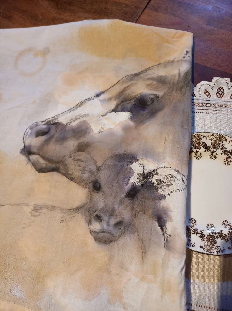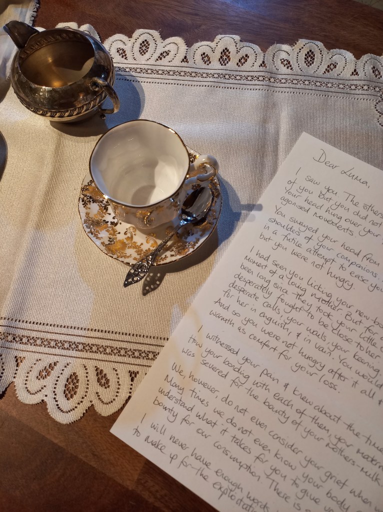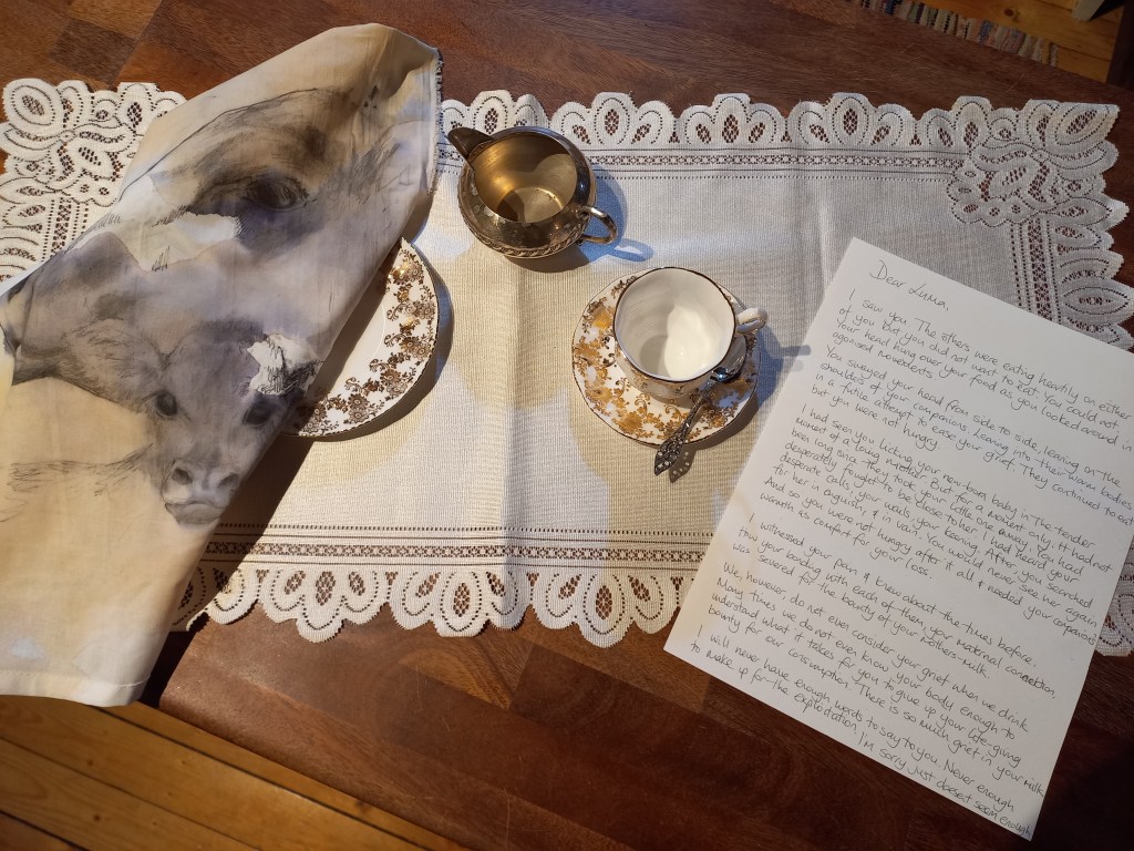 Tea is integral to my mother culture and the consumption of it is exasperated in times of vulnerability. It is a connecting point at my family events and integral to how Irish people gather. When my family gathered in grief at the passing of my father, we consumed vast amounts of tea to help us through dark times. To help us gather in memory of him. However, we were not considering the grief that is intrinsic in the processing and consumption of afternoon tea. It is heavily laden with the intersectional complications and exploitations. There are so many tangled stories involving colonialist global reach, capitalist greed, human-centrism, animal exploitation, vast privilege, unconscious and unconsidered over-consumption, biases, and the grieving processes of humans and our more-than-human companions. In the Afternoon Tea project of 2021 I worked with all these ingredients of an afternoon tea. Here in 2026 I focus on one ingredient, Milk. I work with this afternoon tea ingredient in order to digest the weight of it. On this side table is a small afternoon tea set up. With a porcelain cup and saucer, a silver spoon, an empty jug, a stained napkin (a bovine mother and baby portrait painted with the tea, jam, milk-substitute and ink) and beside, a letter written to our bovine companions: A statement of recognition for our grief inducing exploitative actions; an apology for having afternoon tea. The small-scale installation consists of a tea cup and sauces, jug, silver spoon and a side plate. Alongside which a napkin with a drawing of a mother cow and her baby sits with a letter to a cow called Luma. Luma is the bovine protagonist of a documentary film by the director Andrea Arnold in 2021 called “Cow”. It is a non-verbal film following the story of a dairy cow, Luma, as she goes through the processes involved on a dairy farm in the UK.